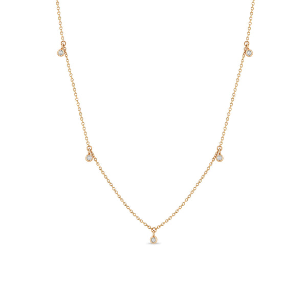 woman wearing two Zoë Chicco 14k Gold 5 Dangling Diamond Bezel Necklaces with two different diamond sizes layered together