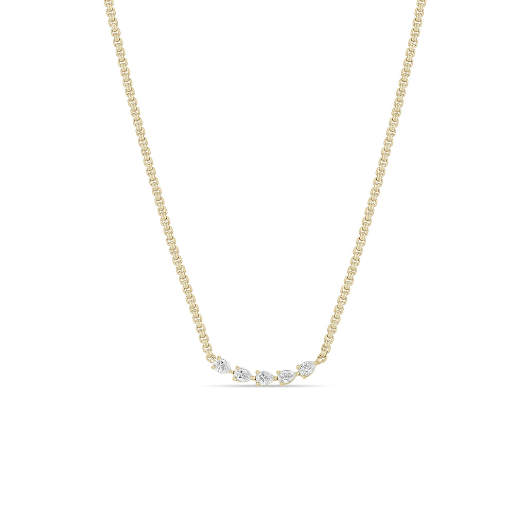 14k gold small box chain necklace with five prong set pear diamonds linked together in the center