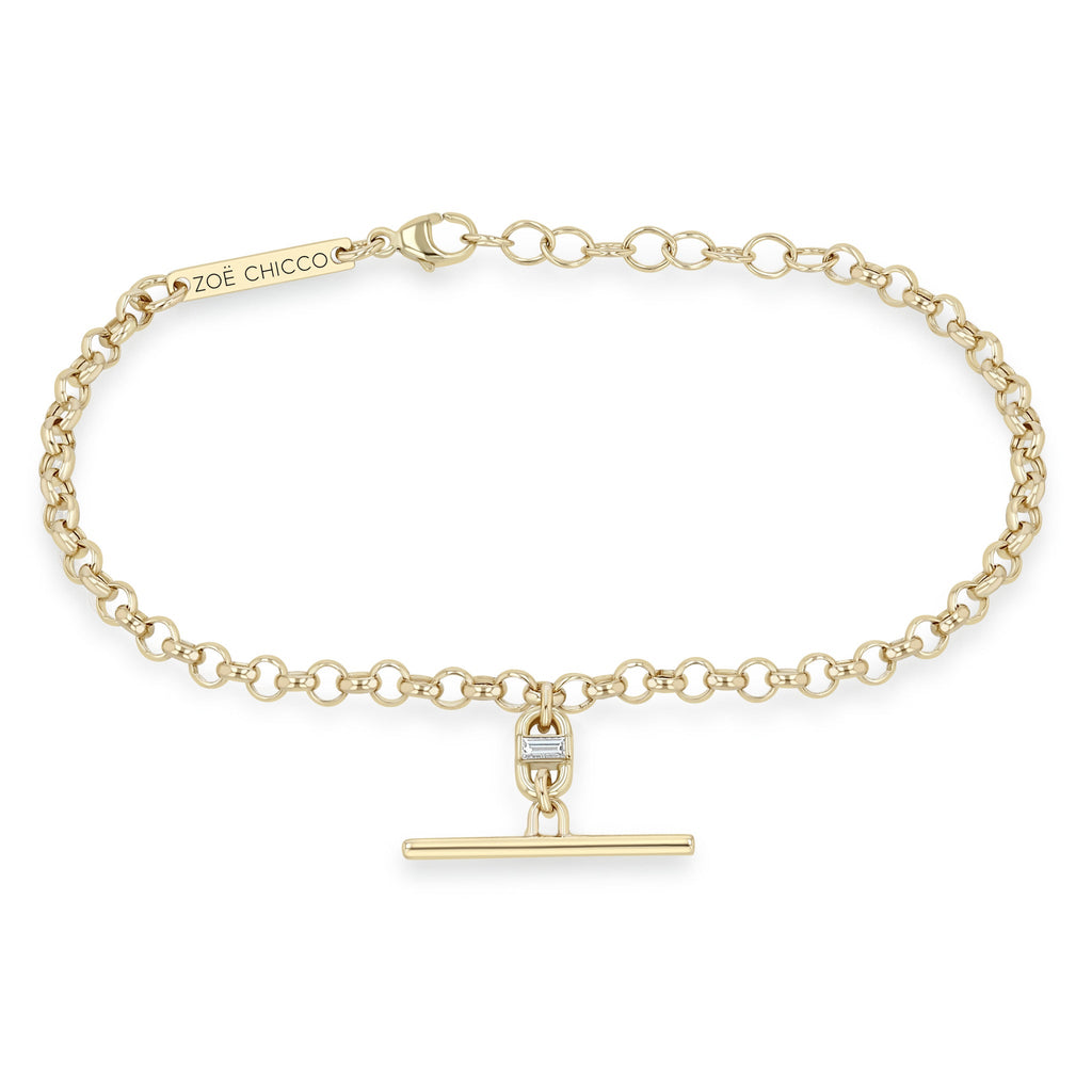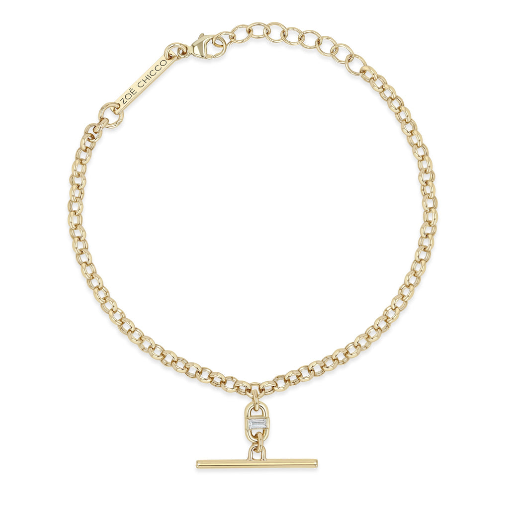 14k gold medium rolo chain faux toggle bracelet with a single open link drop with a bezel set baguette diamond in the center