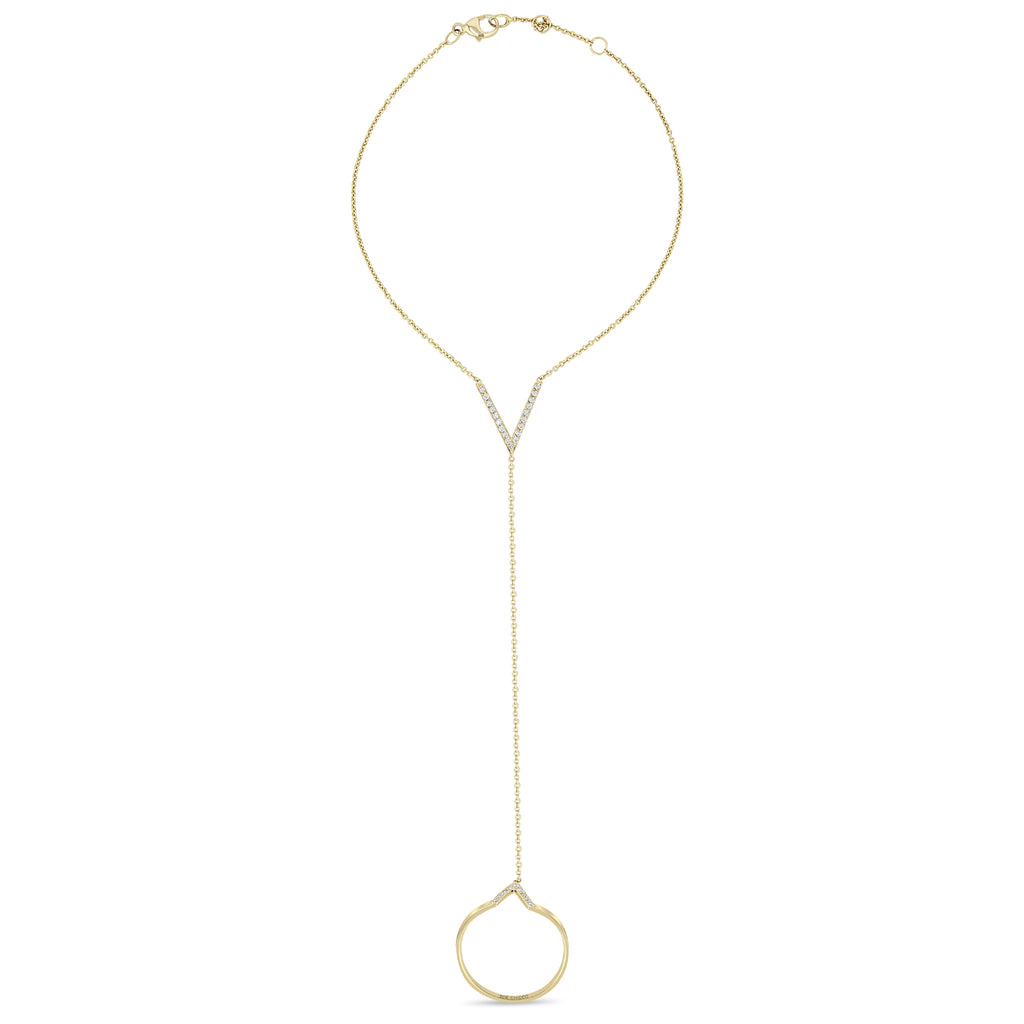 14k gold small V ring chain bracelet with white pavé diamonds set on the ring and the bracelet
