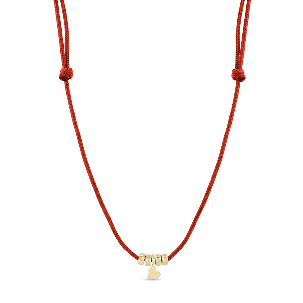 Adjustable paracord necklace featuring four 14-karat gold rondelle beads and a Midi Bitty heart charm hanging in the center