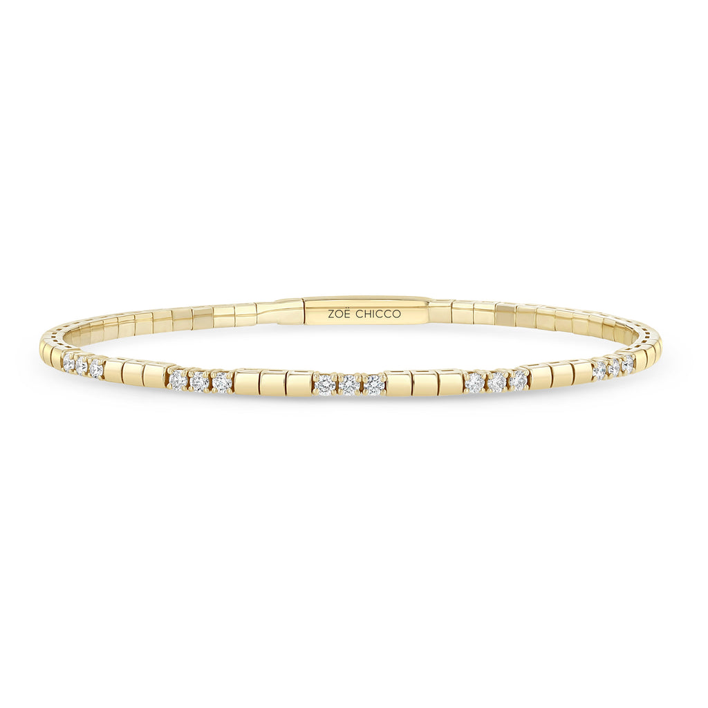 14k gold flex bangle bracelet with alternating gold cubes and prong set round diamond stations and a push lock clasp in the back