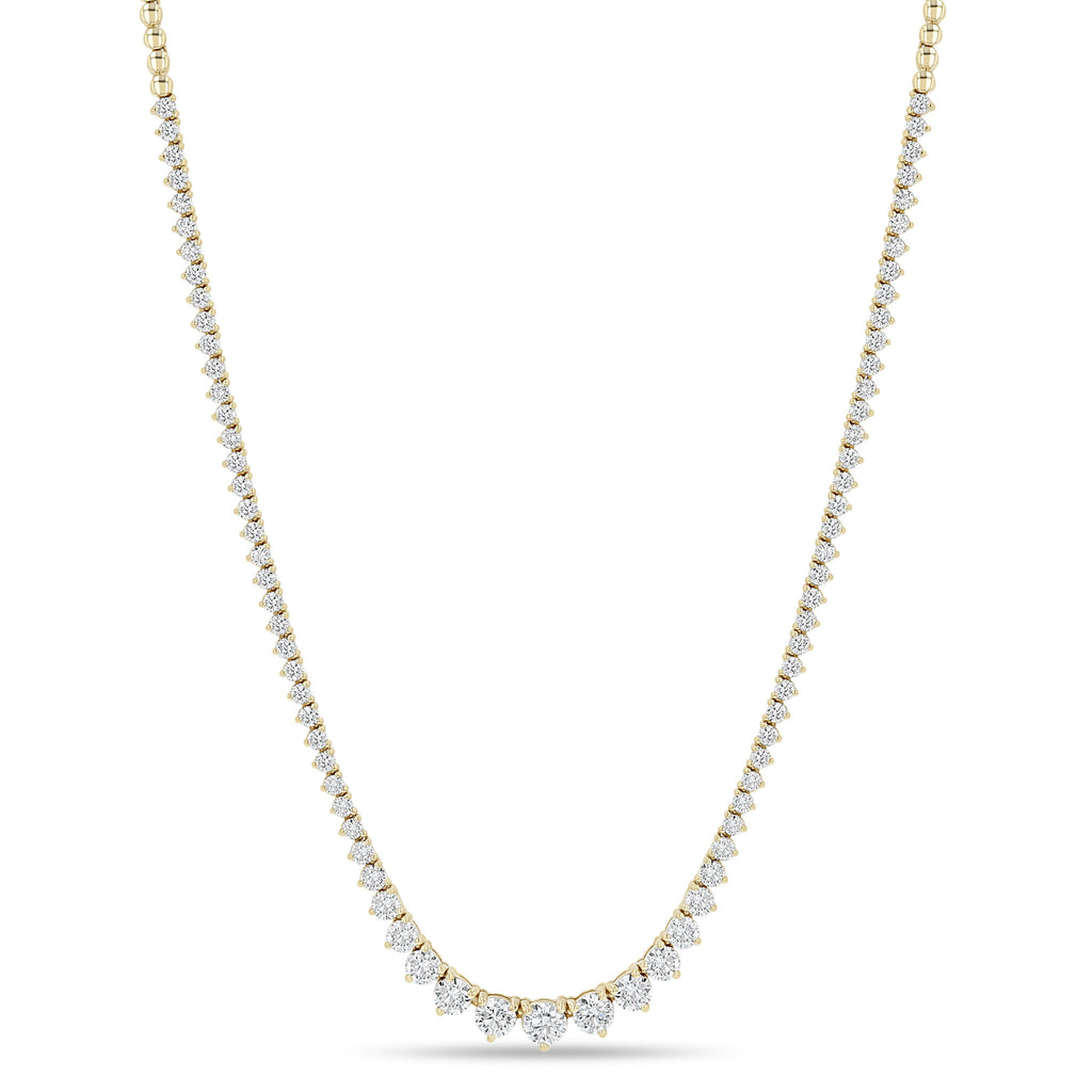 14k gold tennis necklace with prong set diamonds in graduating sizes and gold bead segments on each end with a locking box clasp