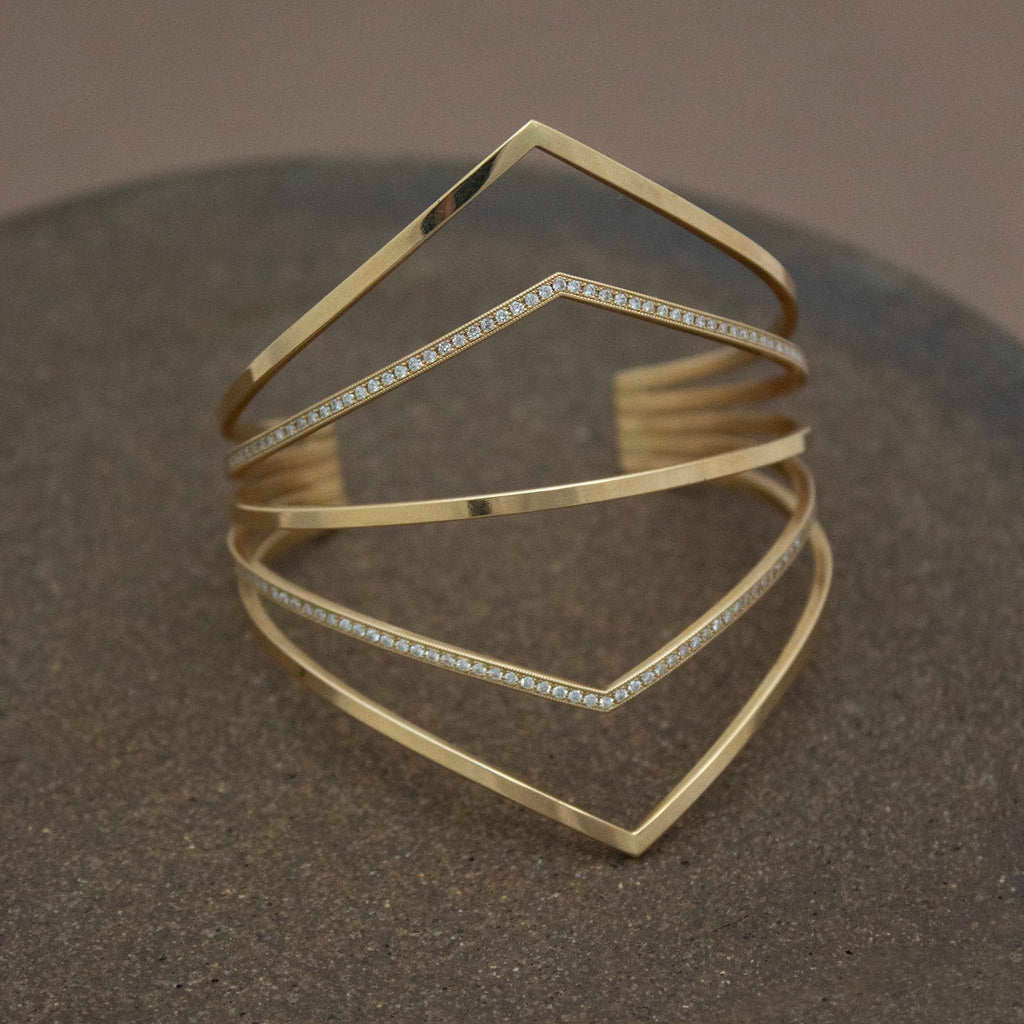 14k gold open cuff bracelet with five total bars connected together at the back and two bars covered with white pavé diamonds