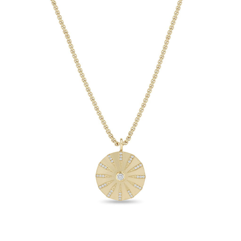 14k gold small box chain with a medium brushed gold domed supernova medallion disc pendant with a bezel set round diamond in the center and pavé diamond rays
