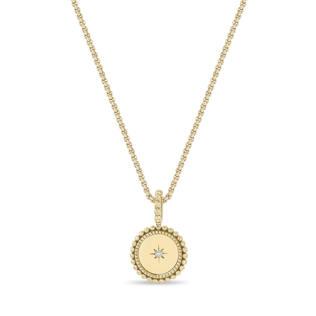 14k gold small box chain necklace with a small disc charm pendant with a beaded border and beaded bail, engraved with a star set diamond in the center