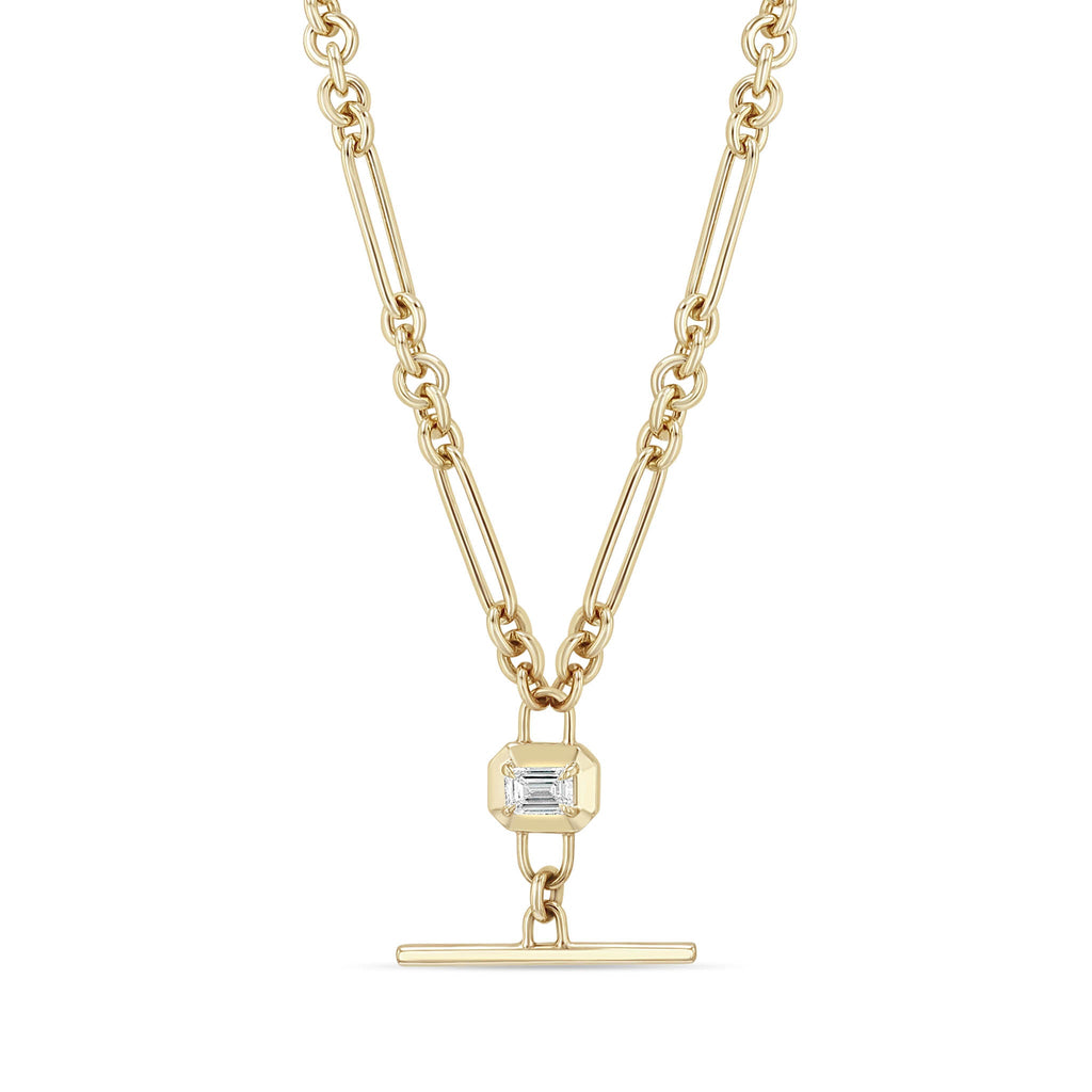14k gold large paperclip and rolo chain faux toggle lariat necklace with a short chain drop featuring a single bezel set emerald cut diamond