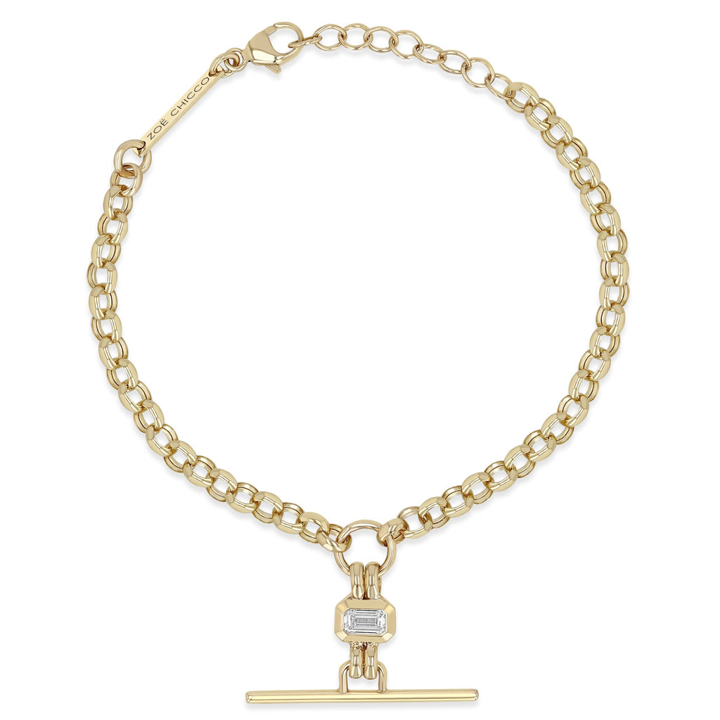 14k gold large rolo chain faux toggle bracelet with a short chain drop featuring a single bezel set emerald cut diamond