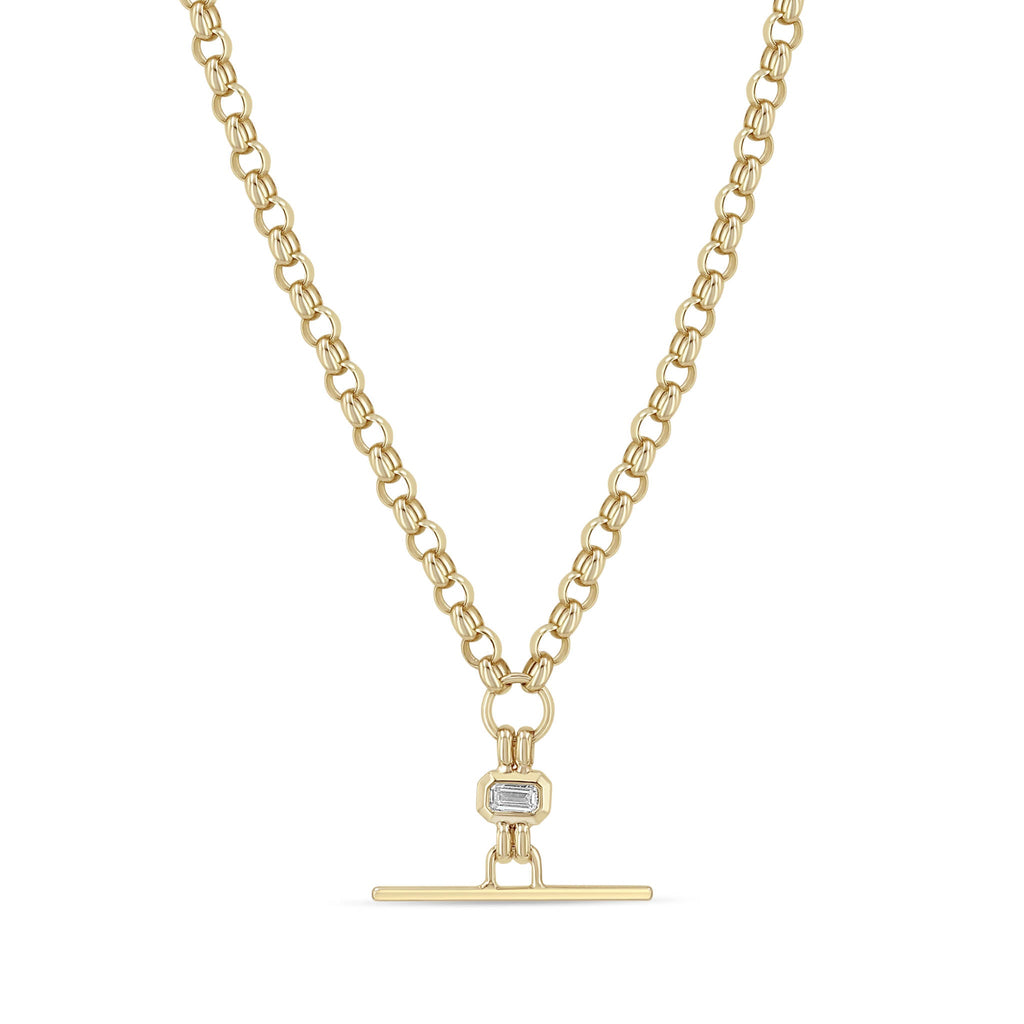 14k gold large rolo chain faux toggle lariat necklace with a short chain drop featuring a single bezel set emerald cut diamond