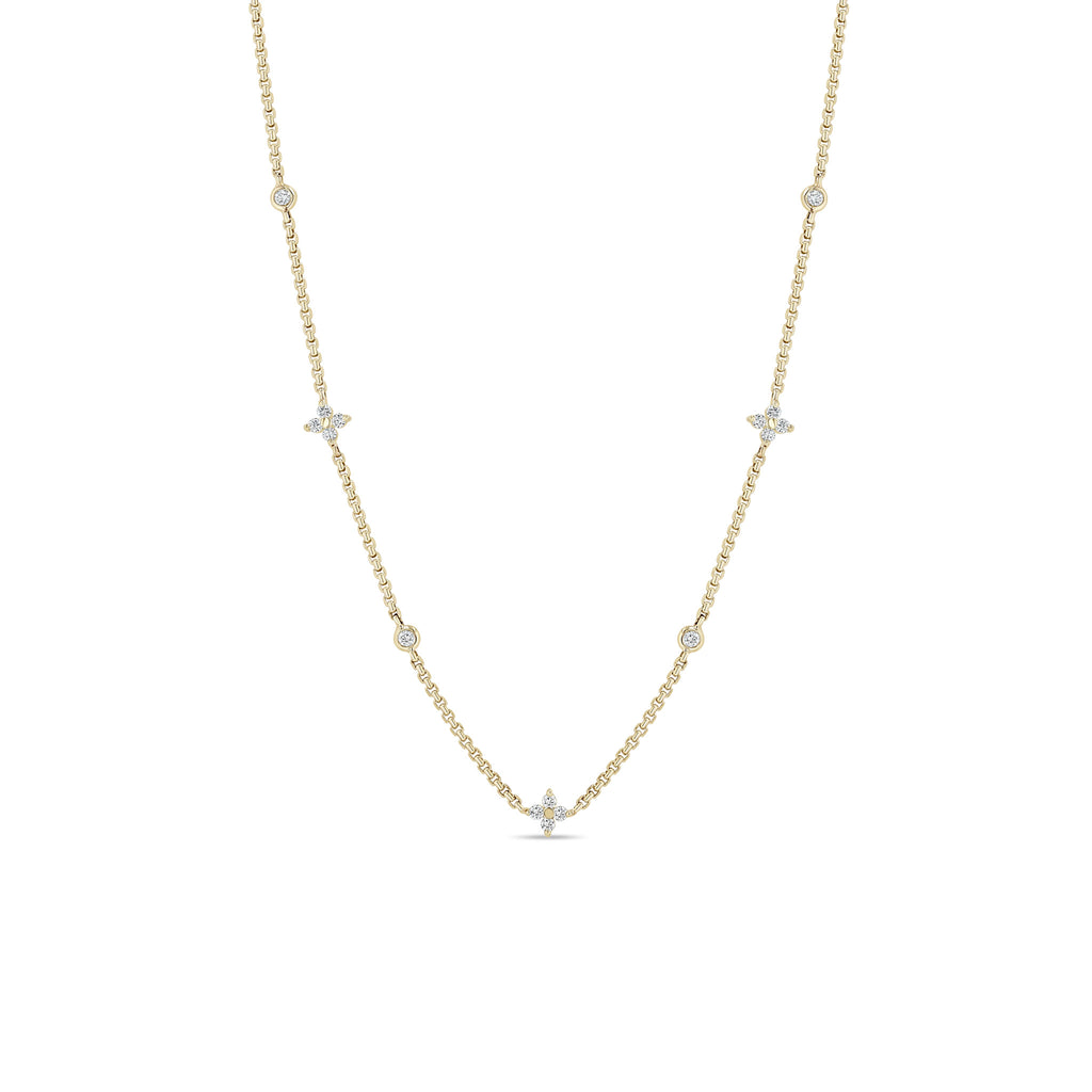 14k gold extra small box chain necklace with three stations of prong set round diamond quads between four floating diamonds