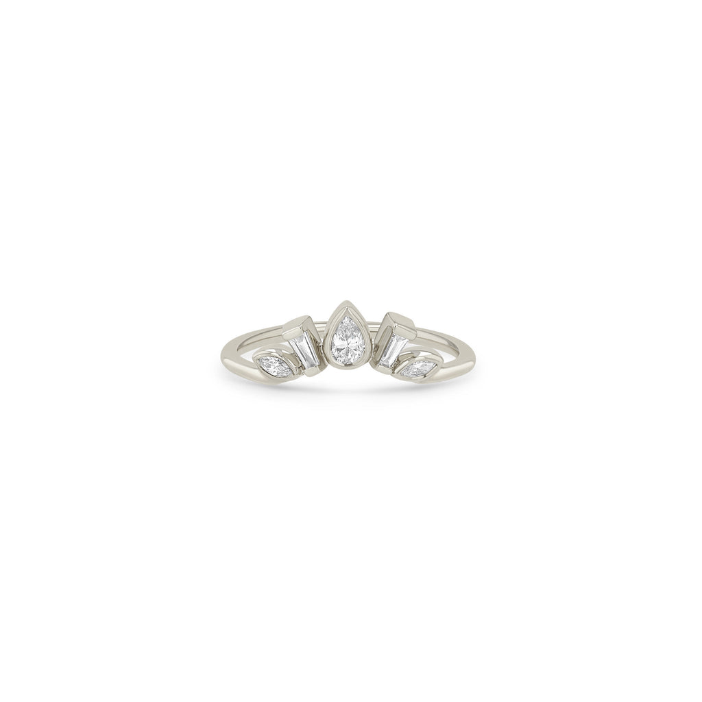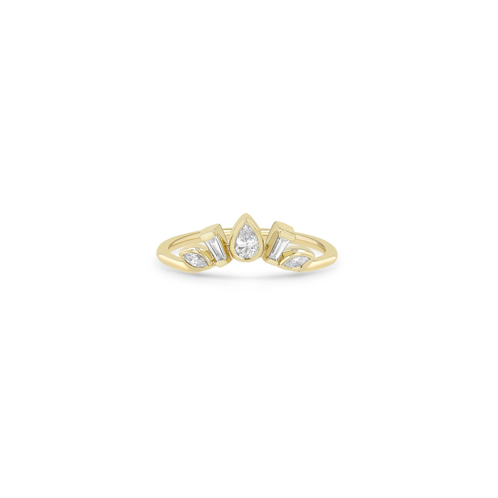 14k gold band ring with a mix of pear, baguette, and marquise set diamonds forming a slight curve