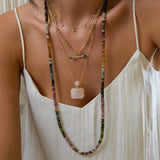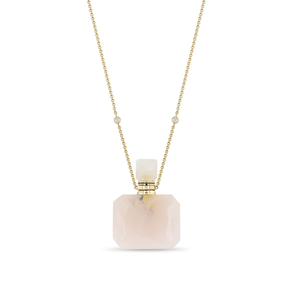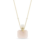 14k gold necklace with four floating diamond stations set in the chain and featuring a rose quartz square perfume bottle
